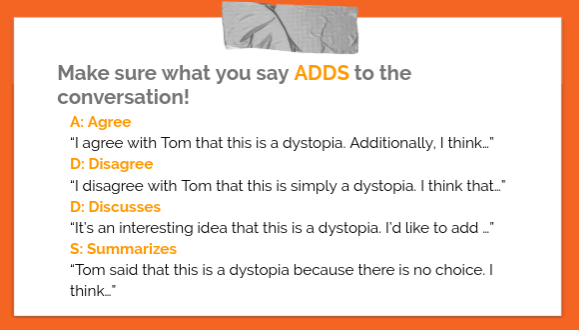 I’ve written about Rotating Chairs before, and you can see examples for Stargirl, The Outsiders, Zootopia (and check out my SML blog and lesson plan) and The Giver to get a feel for the types of conversations that can be sparked. One aspect I’ve failed to discuss previously is the overt instruction of how students should respond. Lately, I’ve been using ADDS to help students remember what to do: